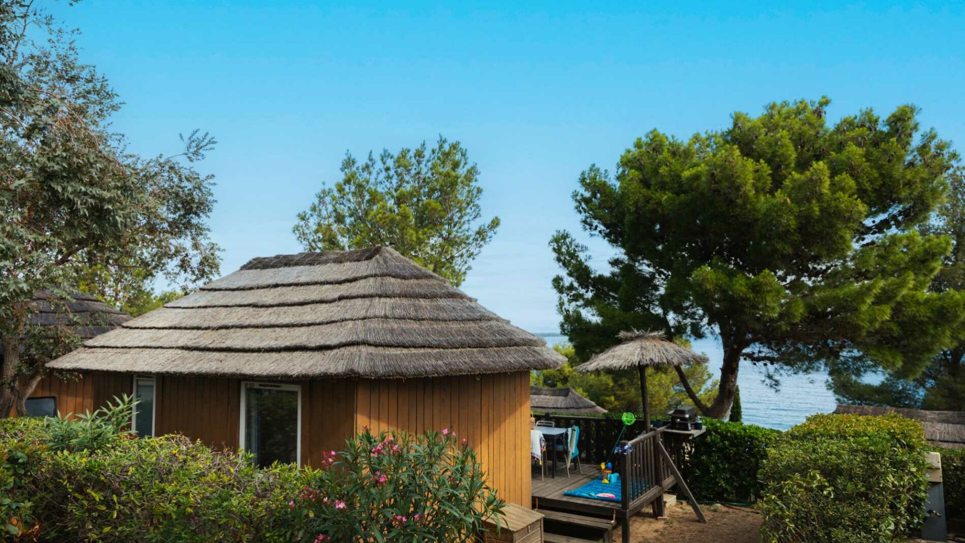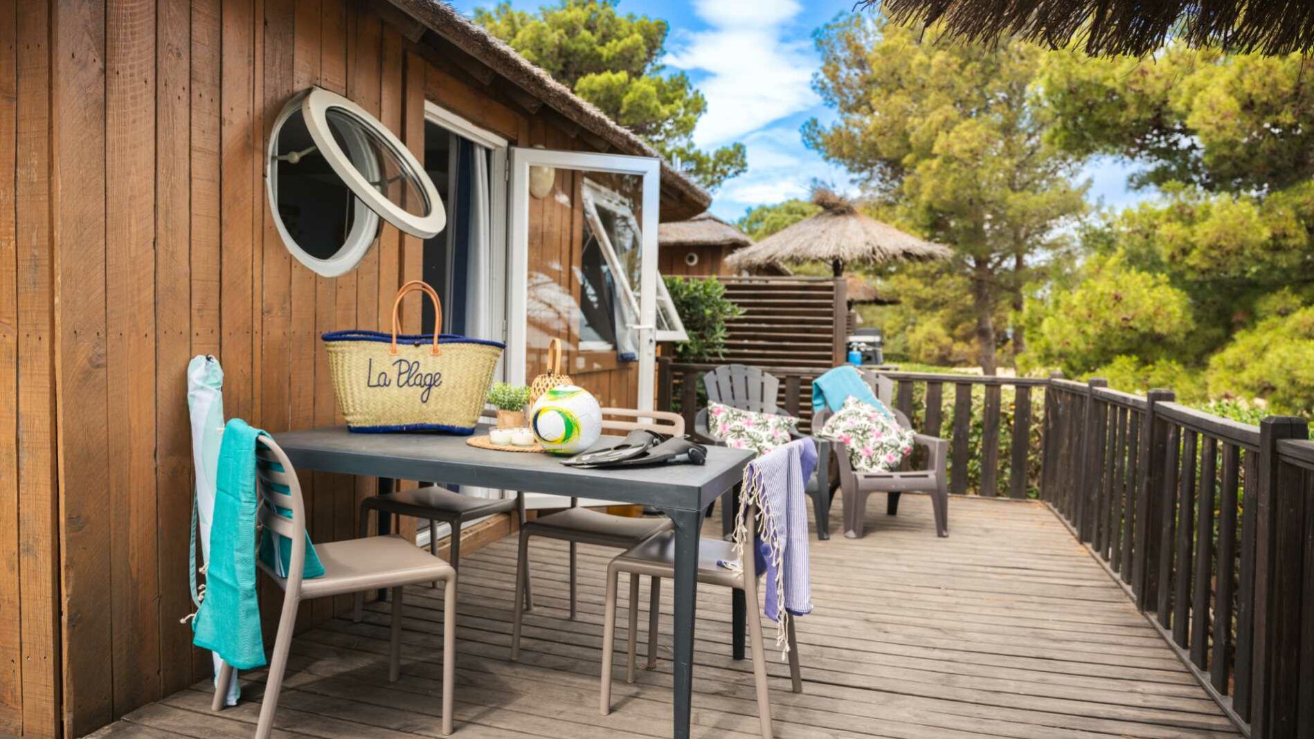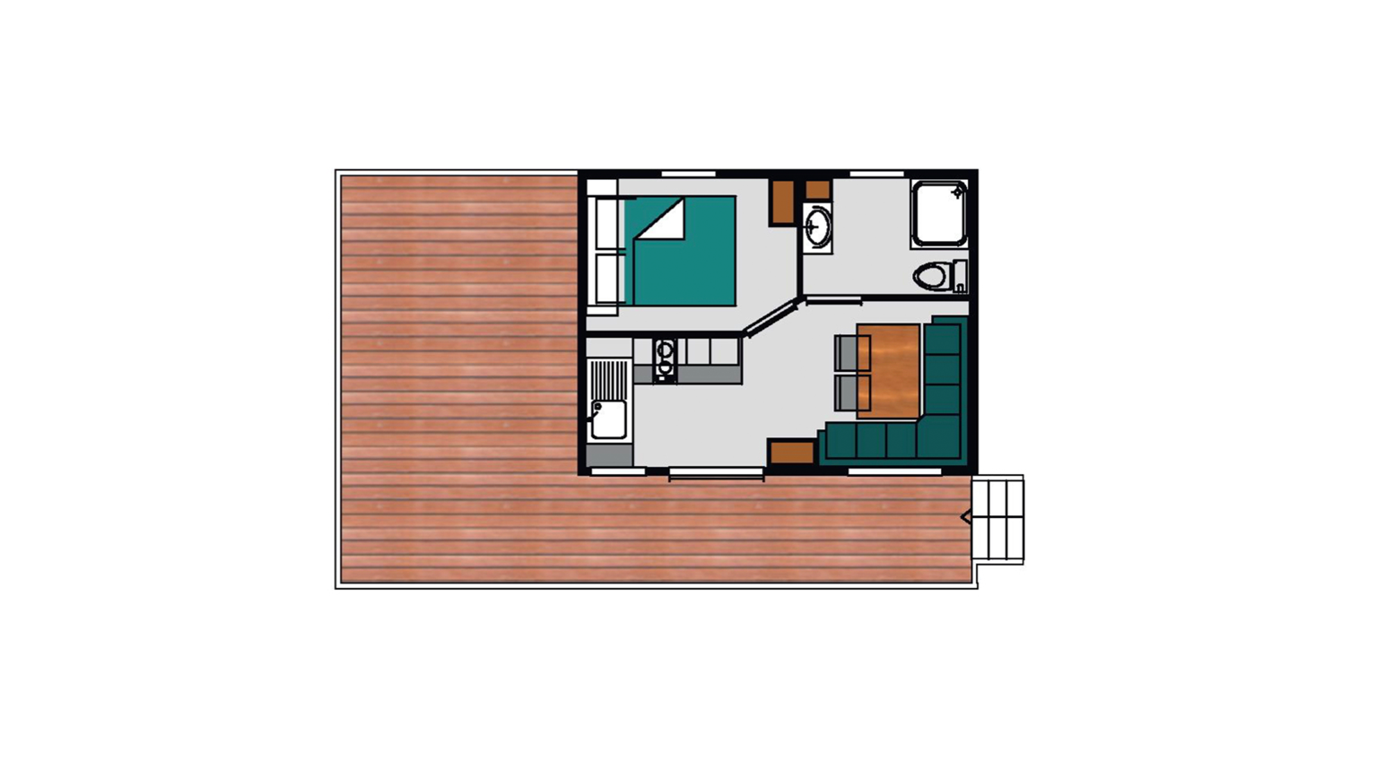 Der Komfort eines Mobilheims, in ein Cottage von 20m². Ein Doppelzimmer mit einem Bett (160 x 200). Eine Sitzecke ausziehbar auf eine Liegefläche für zwei Personen (140 x 190). Eine vollständig ausgestattete Küche. Ein Badezimmer mit Waschbecken, Dusche und WC. Eine Holzterrasse 15m² bis 22m² mit Gartenmöbeln und Sonnenschirm.