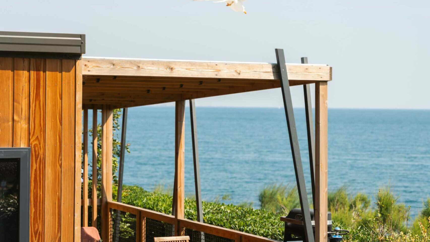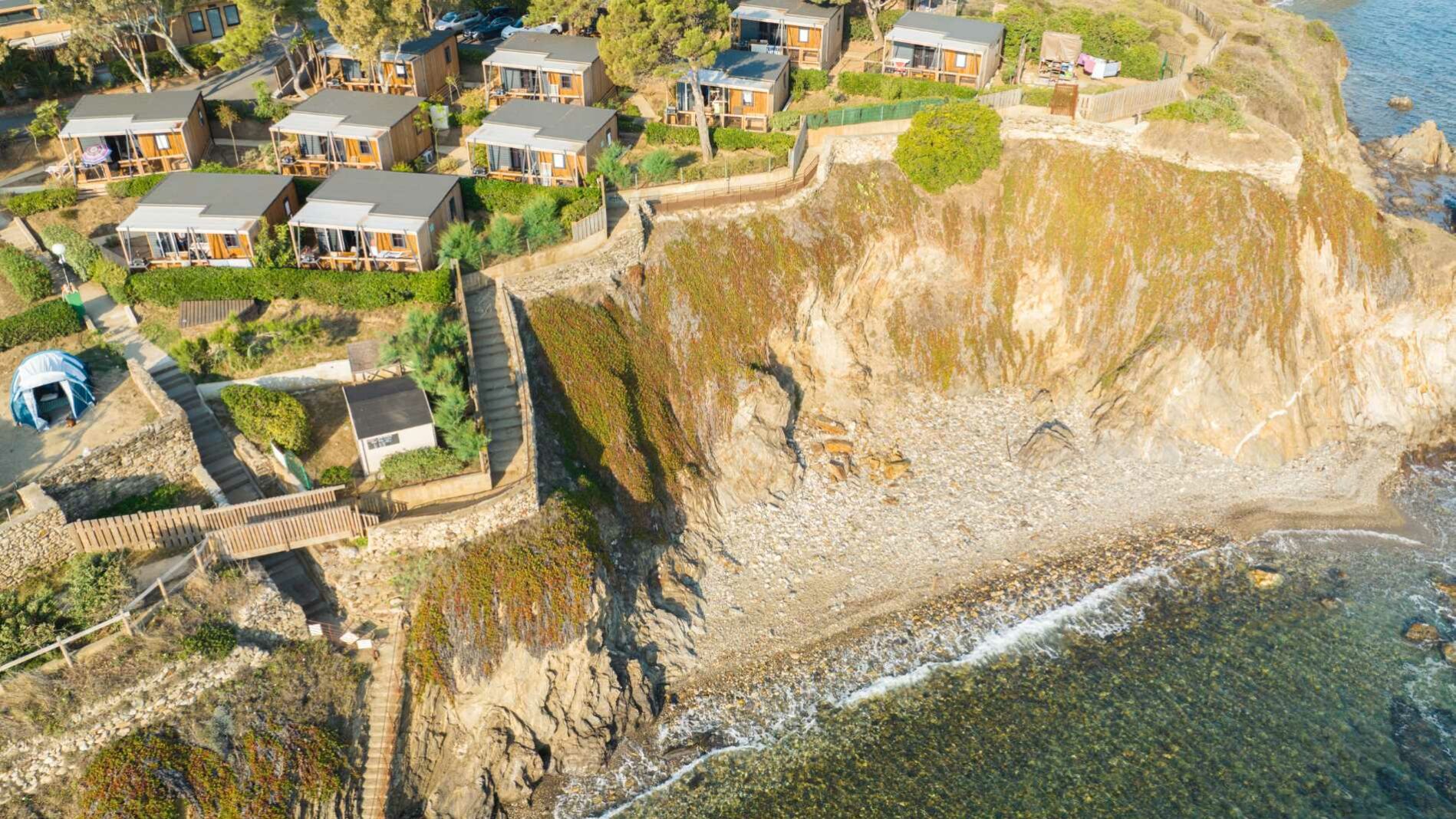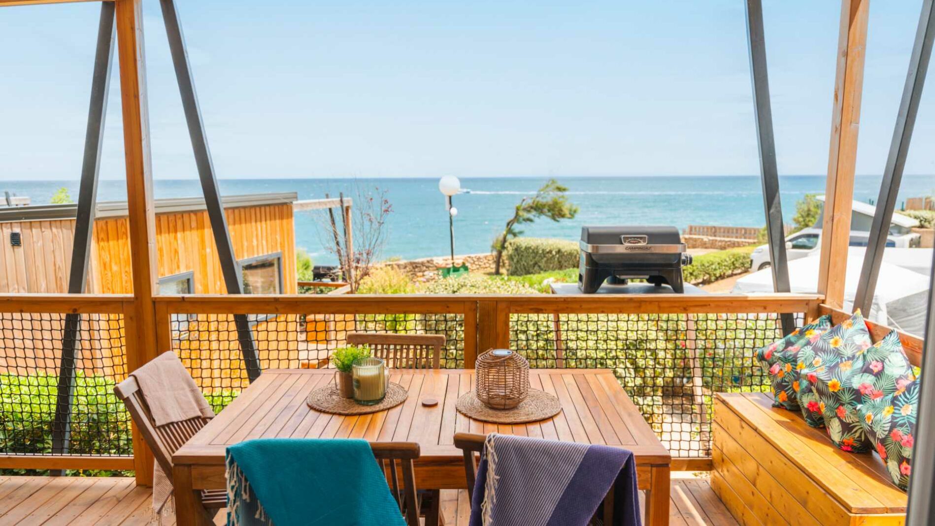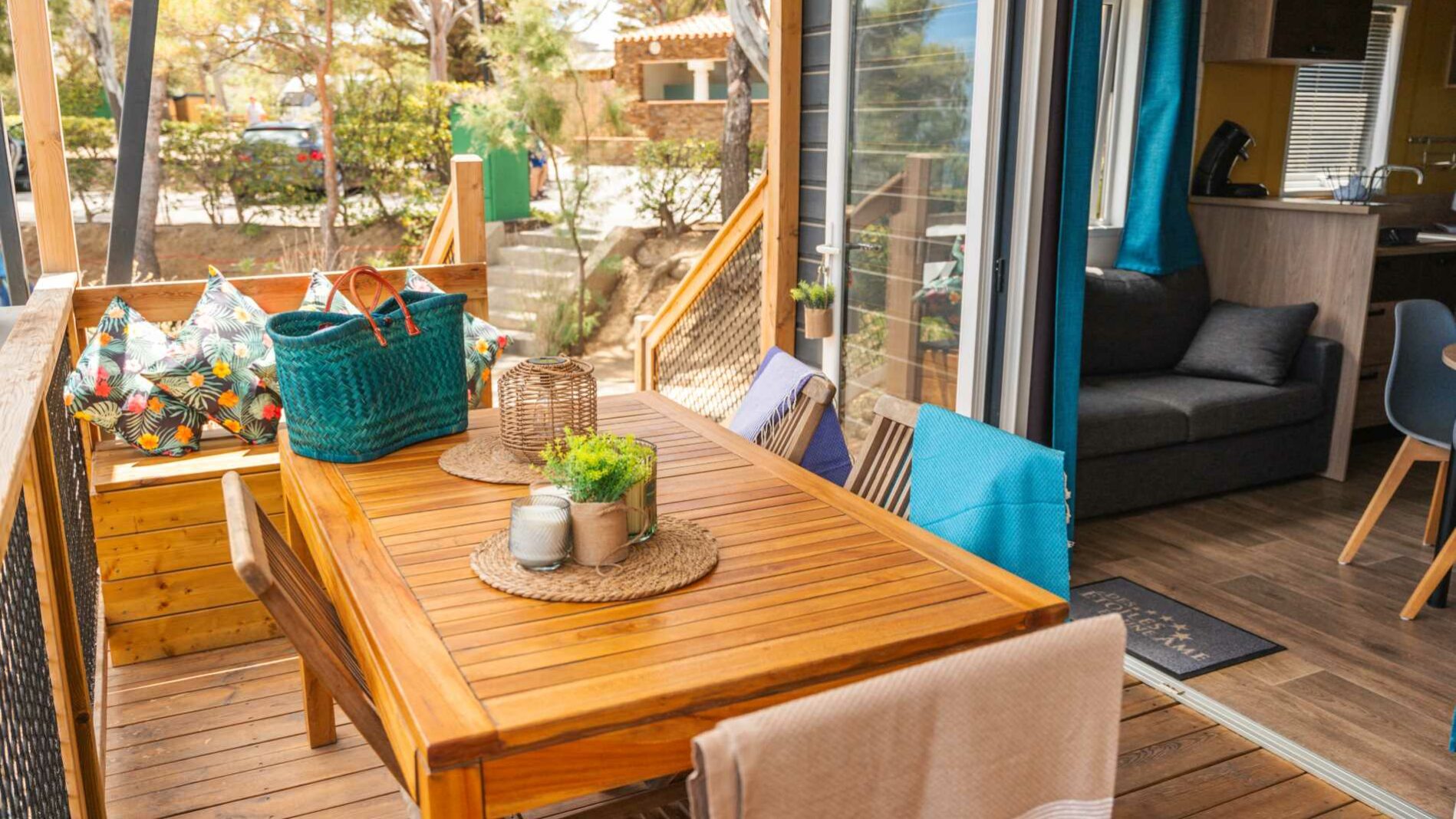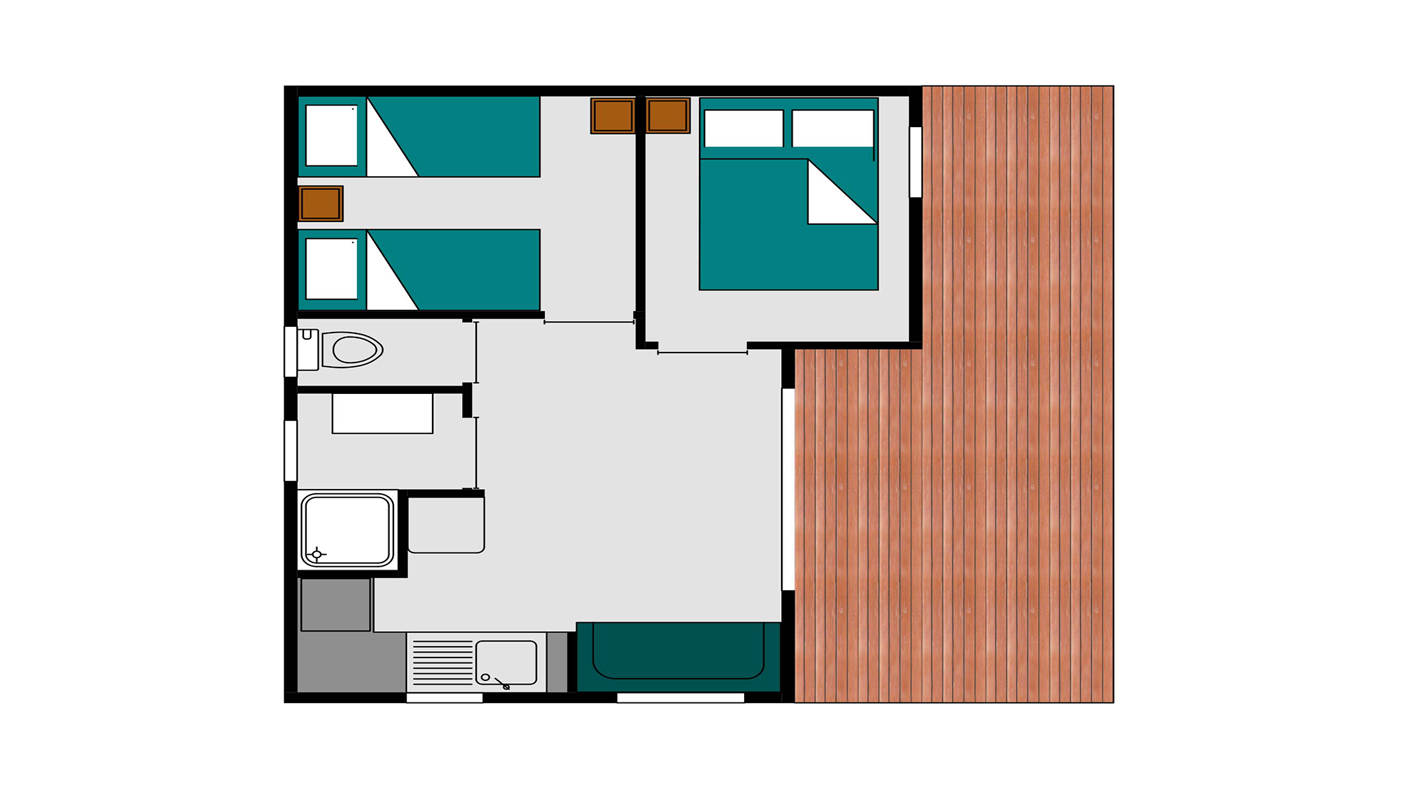 27 m² + Überdachte Terrasse, ein Zimmer mit 1 Doppelbett (140×190), ein Zimmer mit 3 Einzelbetten (80×190) wovon ein Etagenbett. Eine Sitzecke und vollständig ausgestattete Küche. Ein Badezimmer mit Waschbecken, Dusche und WC. Holzmöbel für den Außenbereich. Klimaanlage in dem Elternschlafzimmer.