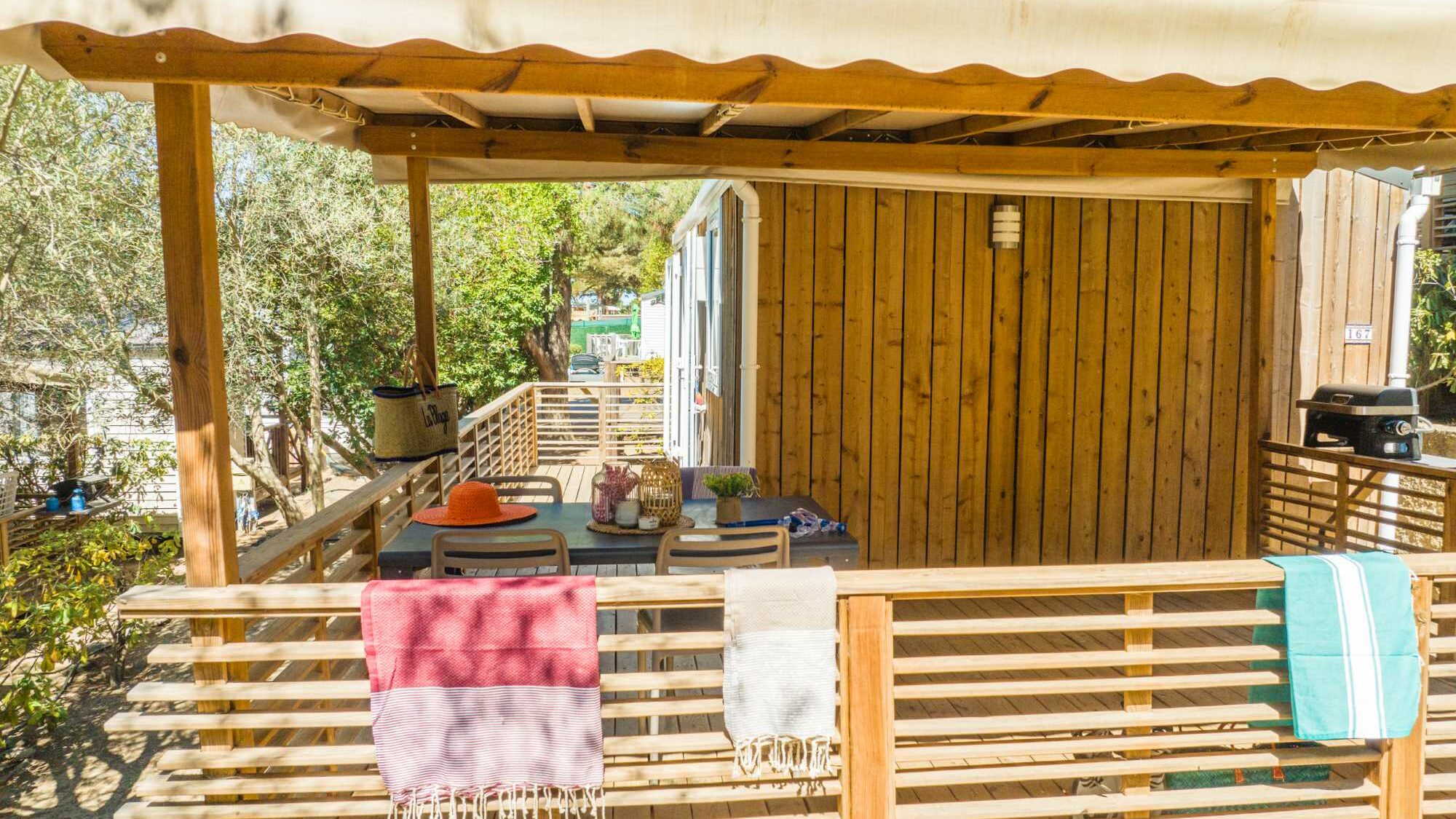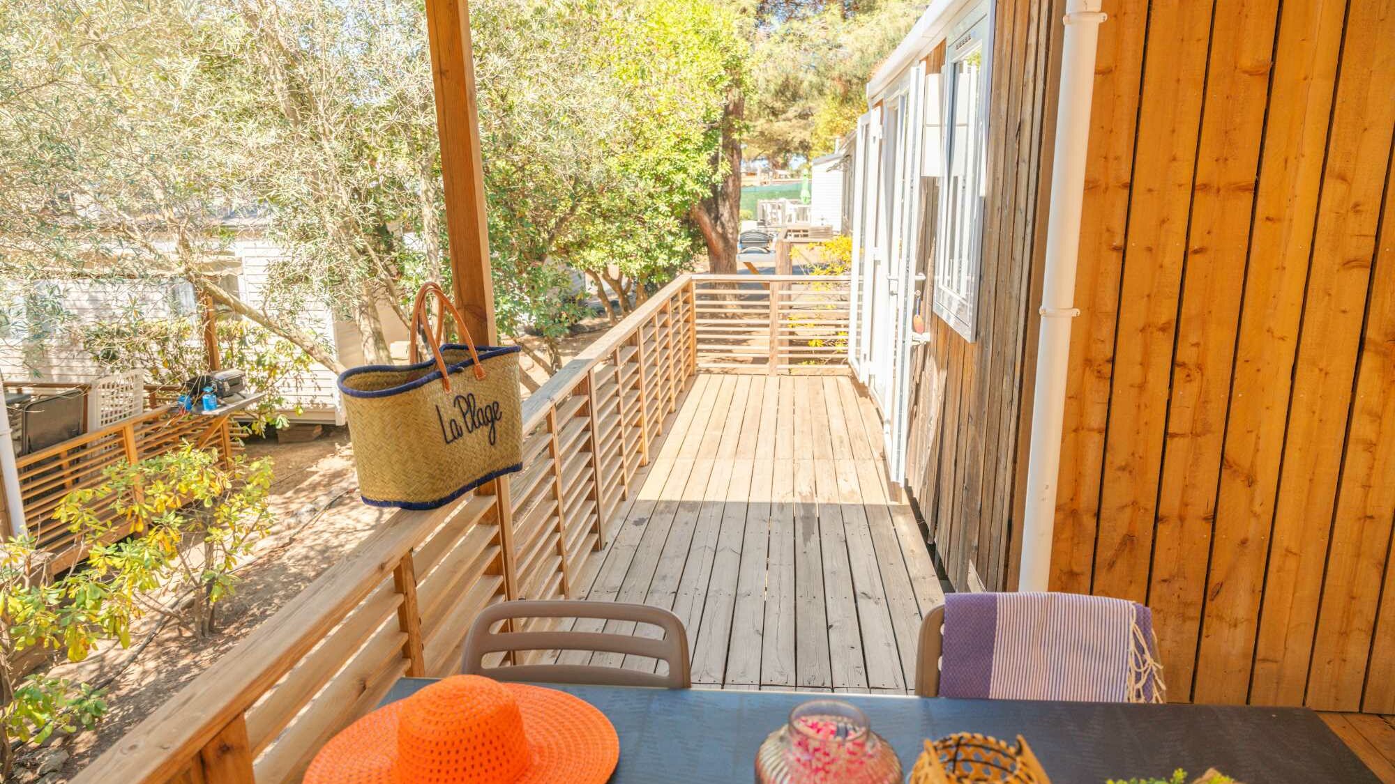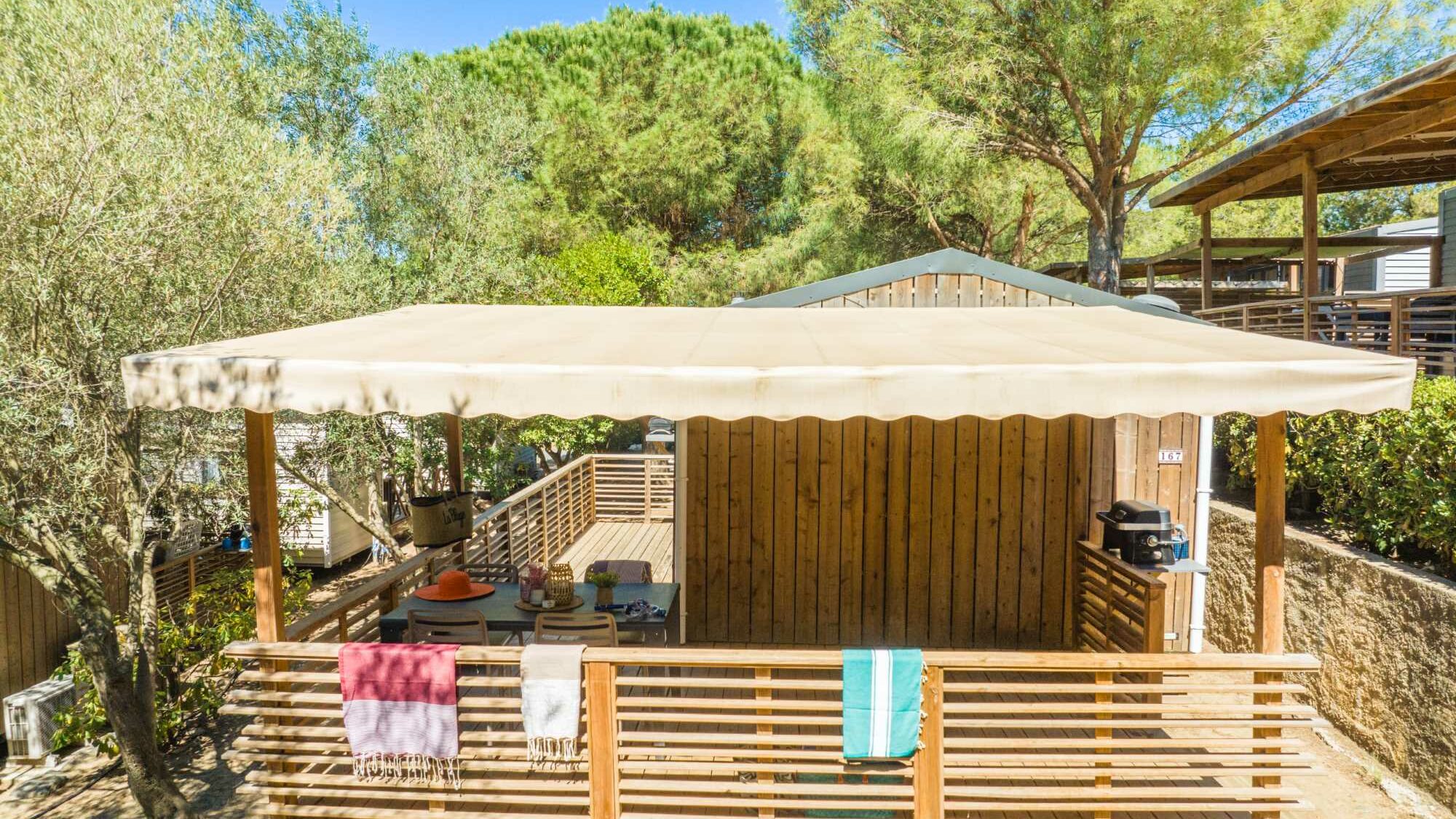 20 m² + 15m² Überdachte Terrasse, ein Doppelzimmer (160 x 200), eine Sitzecke ausziehbar auf eine Liegefläche für zwei Personen (130 x 190). Eine vollständig ausgestattete Küche. Ein Badezimmer mit Waschbecken, Dusche und WC. Gartenmöbel für den Außenbereich.