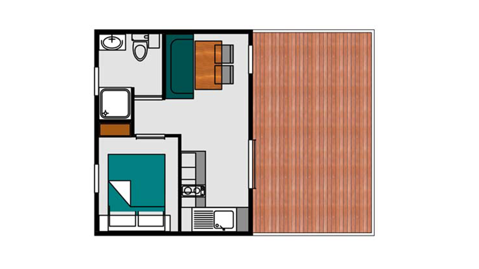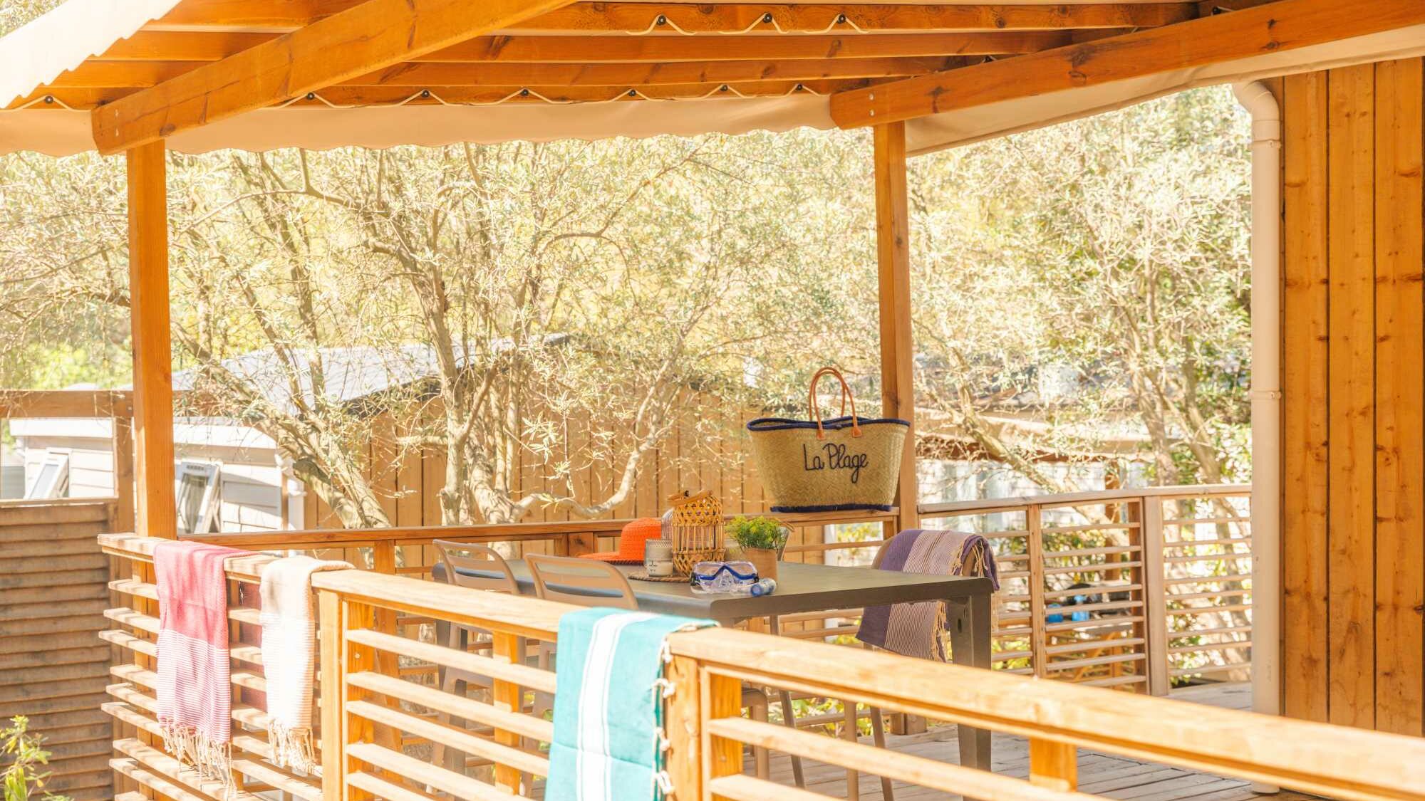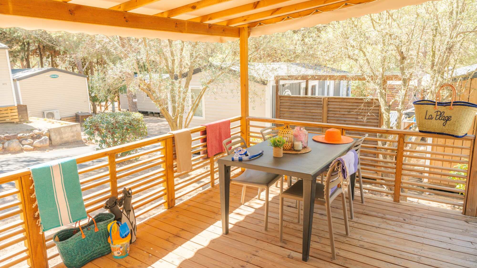 20 m² + 15m² Überdachte Terrasse, ein Doppelzimmer (160 x 200), eine Sitzecke ausziehbar auf eine Liegefläche für zwei Personen (130 x 190). Eine vollständig ausgestattete Küche. Ein Badezimmer mit Waschbecken, Dusche und WC. Gartenmöbel für den Außenbereich.