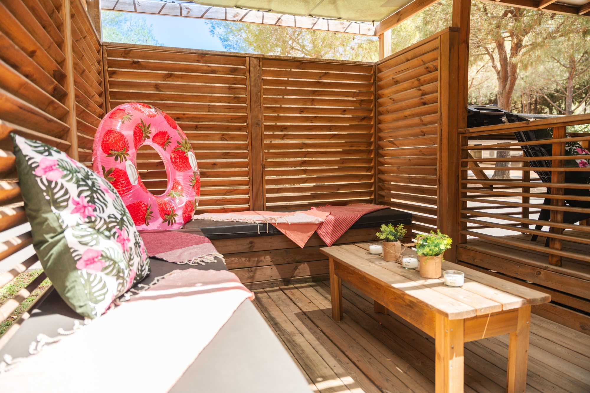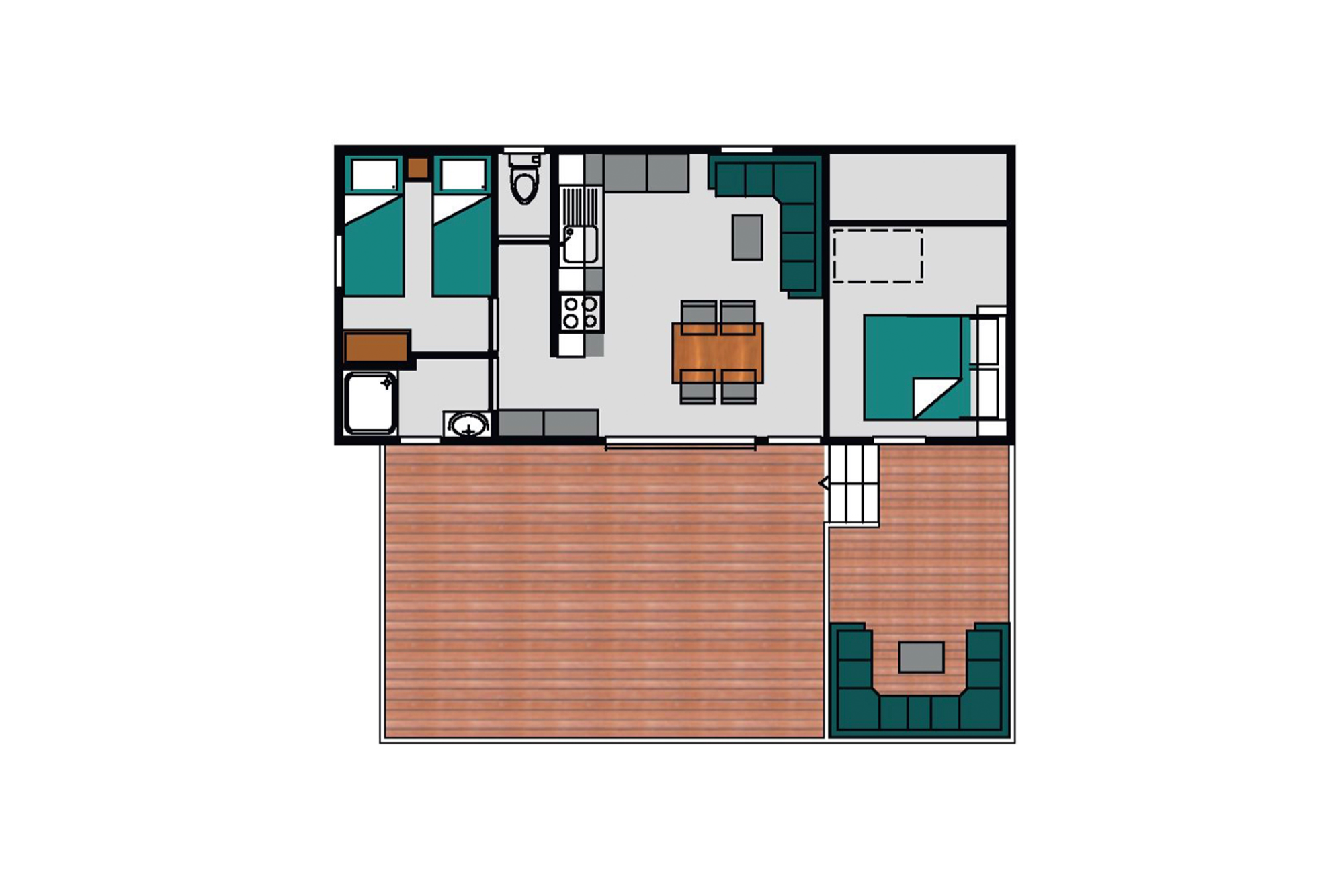 36 m² + 30m² Überdachte Terrasse, ein Doppelzimmer (160 x 200), ein Zimmer mit 2 Einzelbetten (80 x 190), eine Sitzecke ausziehbar auf eine Liegefläche für zwei Personen (130 x 190). Eine vollständig ausgestattete Küche. Ein Badezimmer mit Waschbecken, Dusche und separat WC. Gartenmöbel und Lounge Gartenmöbel für den Außenbereich.